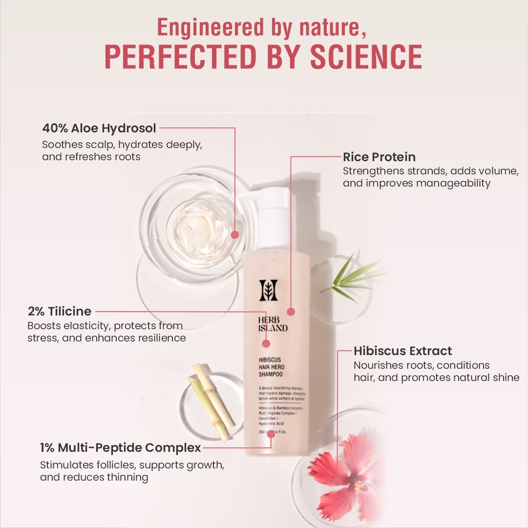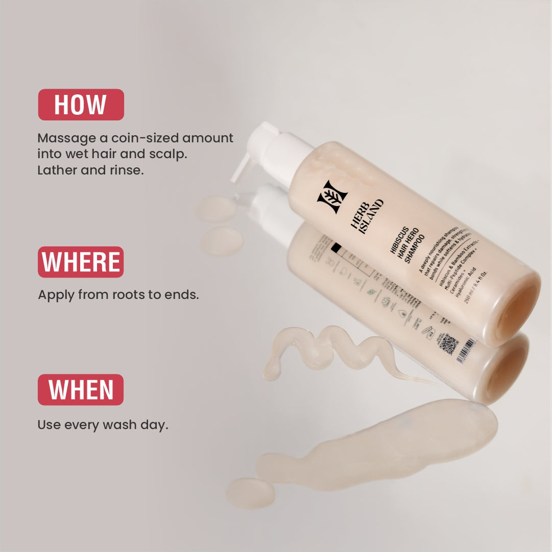 Leave the shampoo on for 1–2 mins for deeper repair. Follow with Hibiscus Hair Hero Conditioner to lock it in.